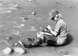 Deborah Ulinski Potter, Research Assistant Professor of Biology, is taking samples along the stream to determine whether the water quality meets state standards. |