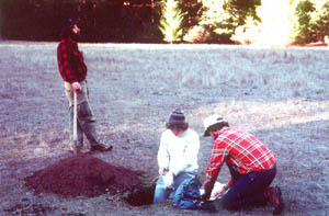 An environmental scientist, Kelly Bitner, and her assistants are collecting soil samples from a test pit. The soil samples were tested in the laboratory to estimate the age of the soil. |